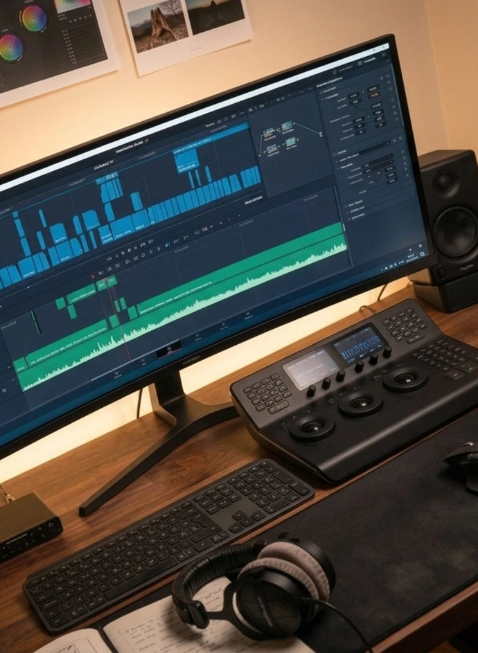Mi flujo de trabajo principal centraliza todo en DaVinci Resolve, aprovechando al máximo los módulos de Fusion para VFX y Fairlight para el tratamiento de audio profesional.